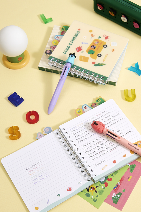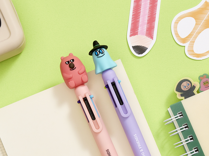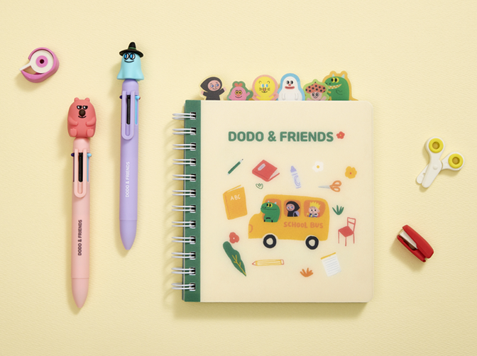 도도앤프렌즈 캐릭터들이 들어간 인덱스 노트와 3D피규어 6색 볼펜